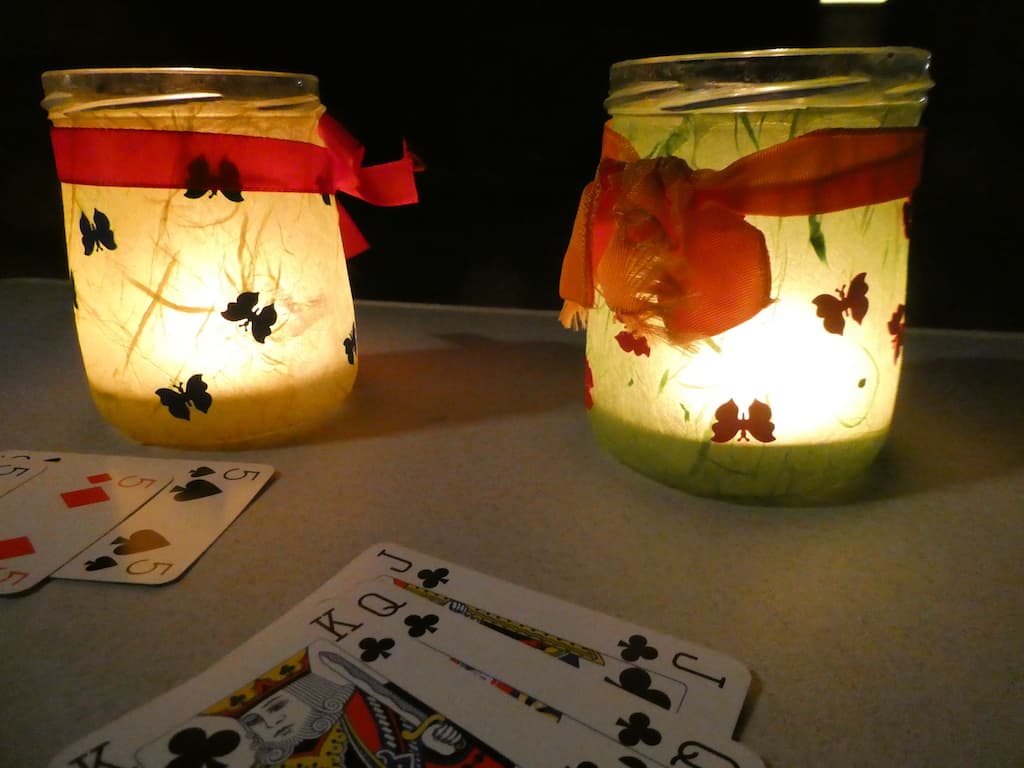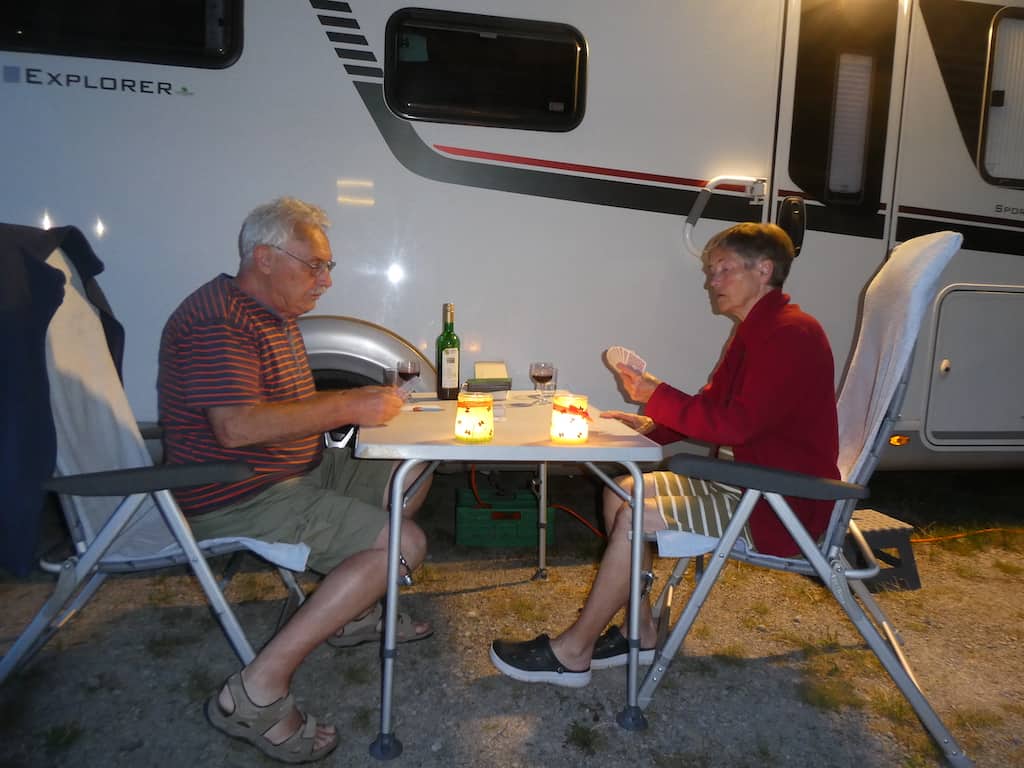 Draussen sind immer noch 23°. Da konnten wir erstmals bis zum Schluss im Freien Karten spielen. Dabei erfreuen uns wieder die Windlichter unserer Enkel Silvan und Levin.