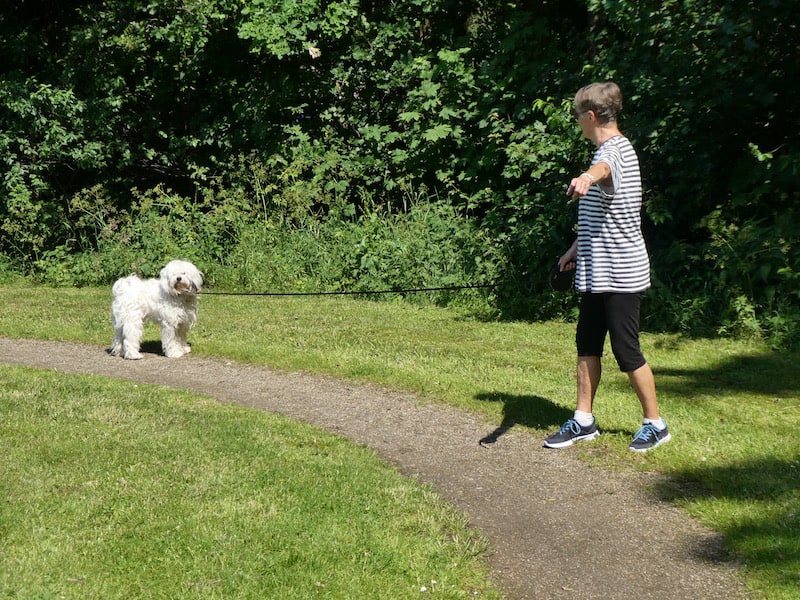 Endlich raffen wir uns zu einem schönen Spaziergang rund um den Maiglöckchensee auf. Wir nehmen den Nachbarshund mit. Er heisst „Einstein“ und ist ein Tibet Terrier.