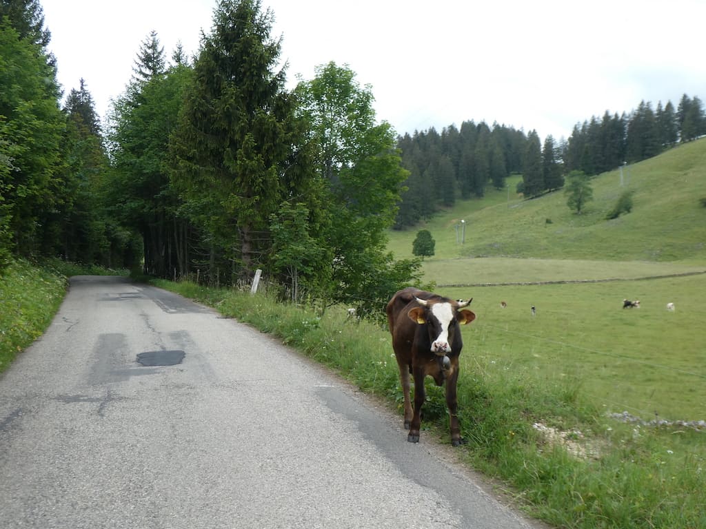 Auf der schmalen Strasse kommt uns zuerst eine entlaufene Kuh entgegen, was wir beim nächsten Bauernhof melden. Die Bäuerin will sich darum kümmern, obwohl es nicht eines ihrer Tiere ist.
