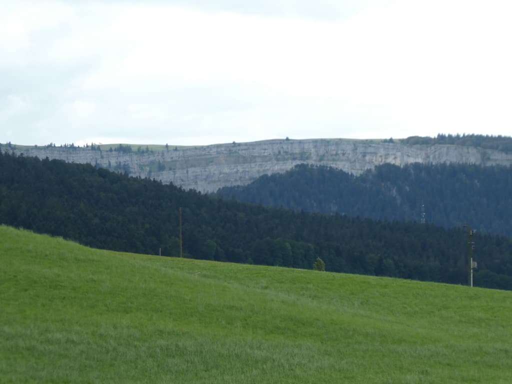 Von der Hochebene bei Les Petit-Ponts sehen wir hinüber zu dem gewaltigen Felsenkessel des Creux-du-Van. Später kommen wir hinunter ins Val de Travers und zum Fluss L’Areuse.