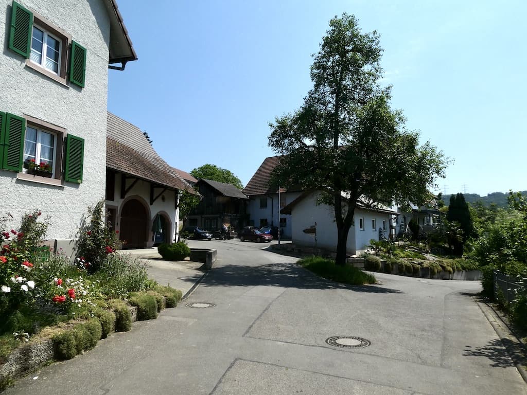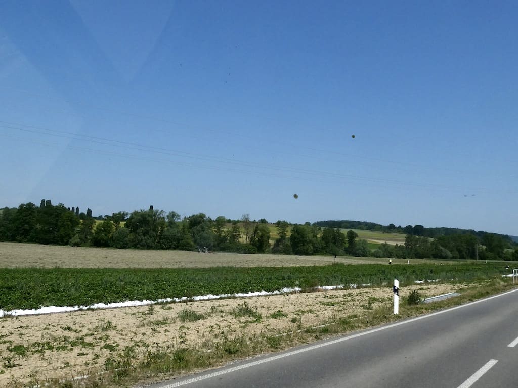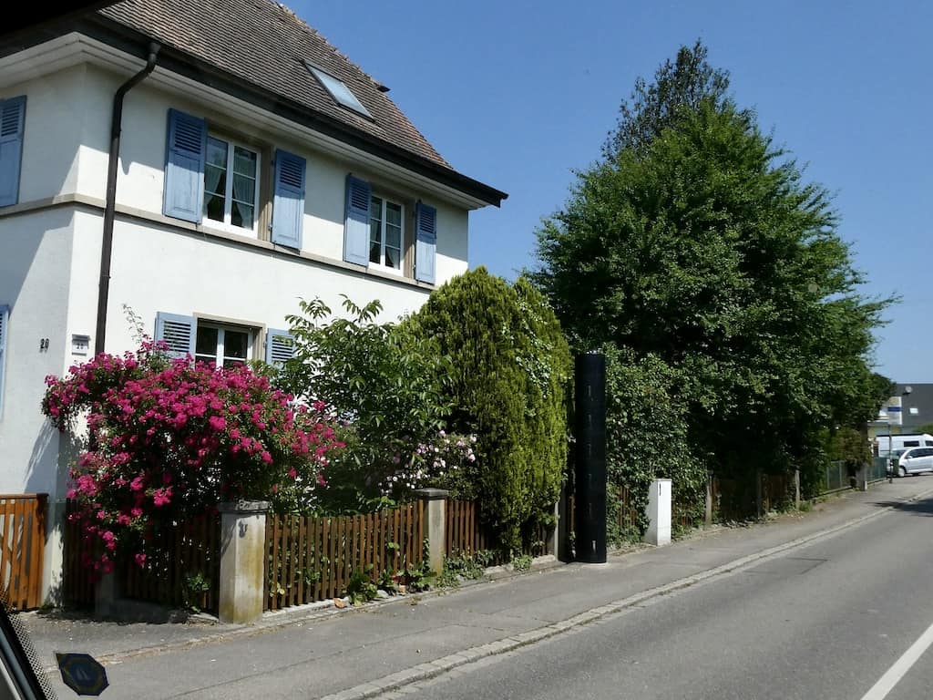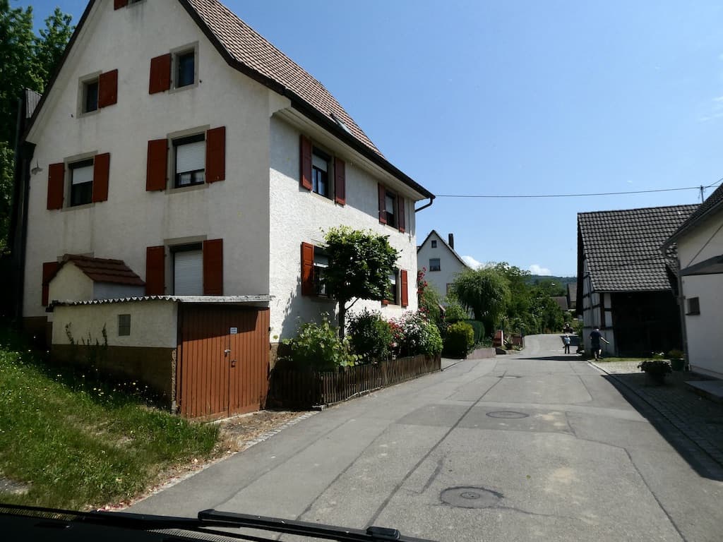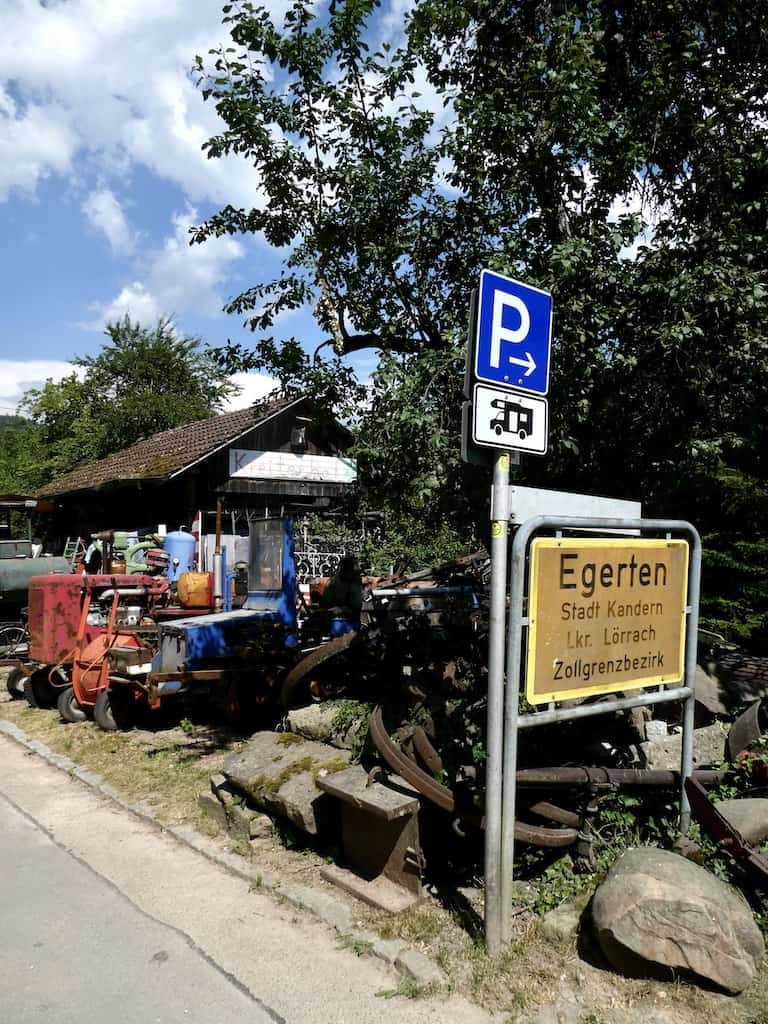 Nach dem Einkauf geht es ein kurzes Stück über Land Richtung Kandern. Es gibt hier viele 30ger und 50ger Geschwindigkeitszonen. Und ebenso viele Blechpolizisten, die deren Einhaltung kontrollieren. Das sind meistens so unscheinbare schwarze Säulen wie auf diesem Foto am Strassenrand, die sehr teuer werden können.