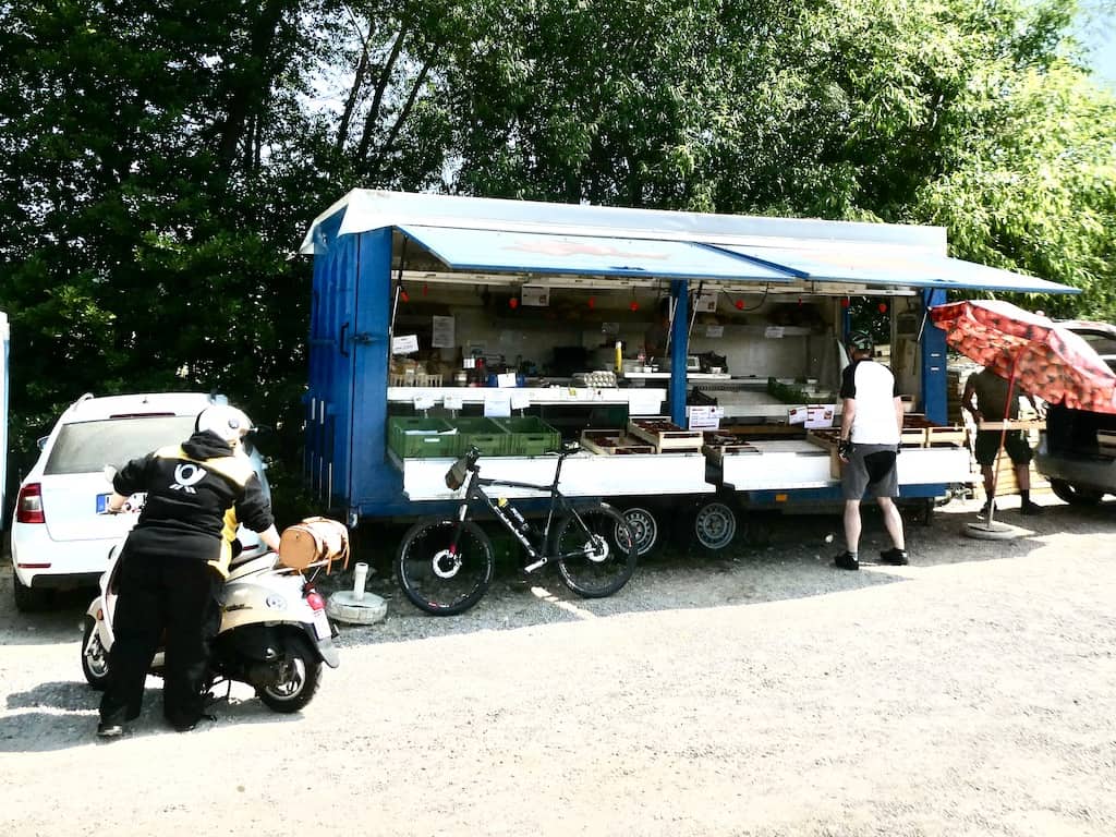 In dieser Gegend kann man Erdbeeren selbst vom Feld pflücken. Wir ziehen den Kauf bei der Obstbäuerin vor.