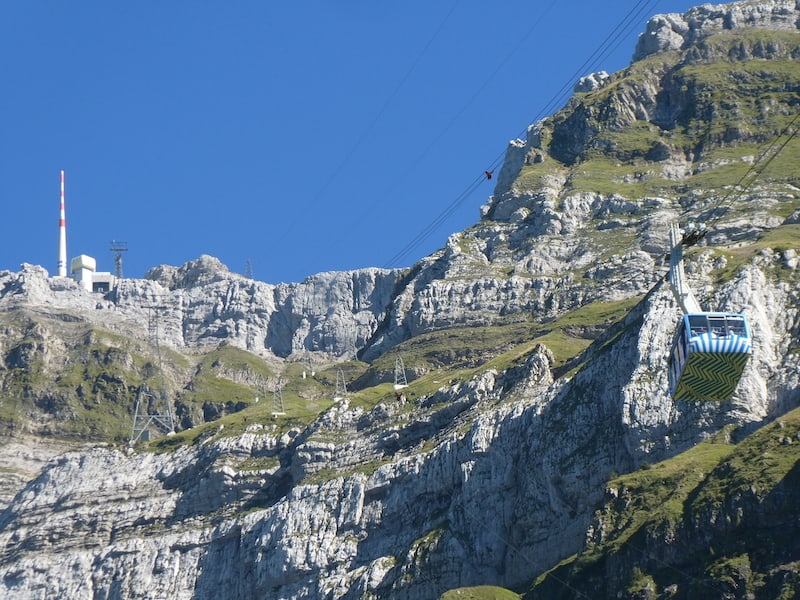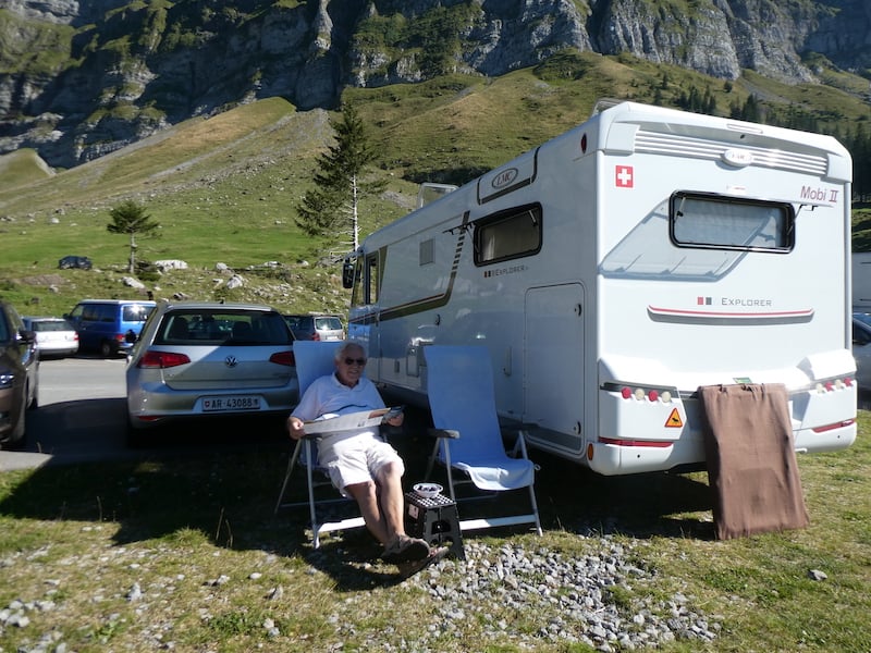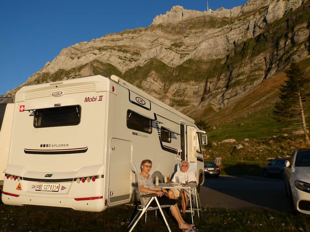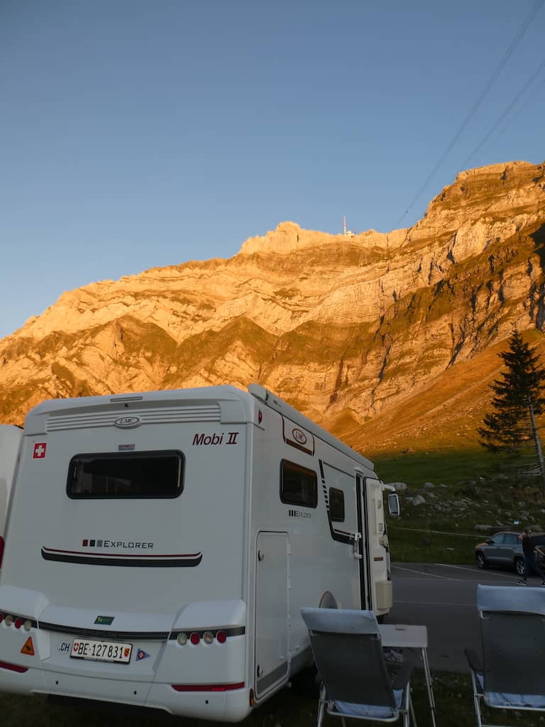 Erst am späten Nachmitttag, als die ersten Besucher wieder abfahren, bekommen wir einen guten Stellplatz für die Nacht, denn morgen wollen wir dann mit der Schwebebahn hinauf auf den Säntis.