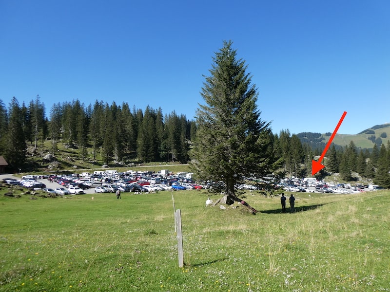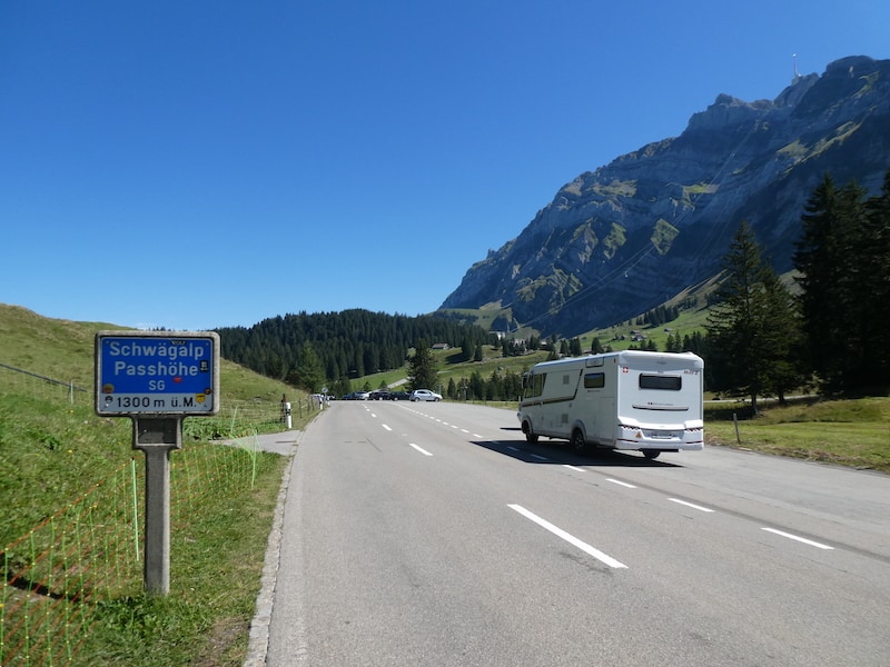 Von der Passhöhe auf 1300 m.ü.M. geht es noch etwas höher hinauf zur Talstation der Säntis-Schwebebahn. Der Parkplatz auf 1350 m.ü.M. ist schon rappelvoll. In der hintersten Ecke finden wir gerade noch Platz.