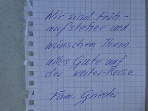 Die Wegfahrt der netten Schweizer Nachbarn haben wir verpennt, was sie uns sehr subtil auf einem Zettel mitteilten. Ja, bei uns brannte gestern Nacht auch noch lange das Licht.