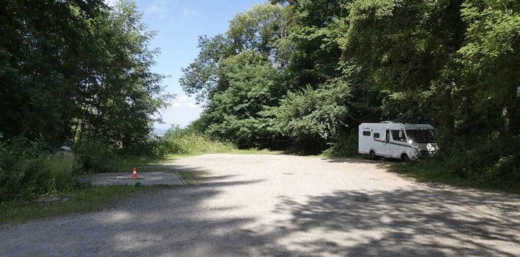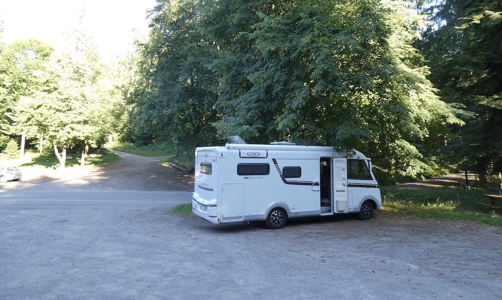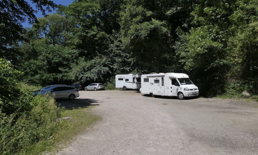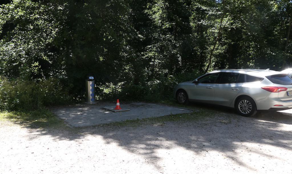 Zurück beim Parkplatz sind wir nicht mehr so alleine. Auch Personenwagen suchen hier ein schattiges Plätzchen, da die weiter oben gelegenen Parkplätze viel Sonne haben. Blöd ist nur, dass sie dabei zu nahe an der Entsorgungsstelle parken. Sie können ja nicht wissen, dass die meisten Camper längs über die Grauwassergrube fahren müssen. Vermutlich wissen das die Planer der Entsorgung auch nicht.