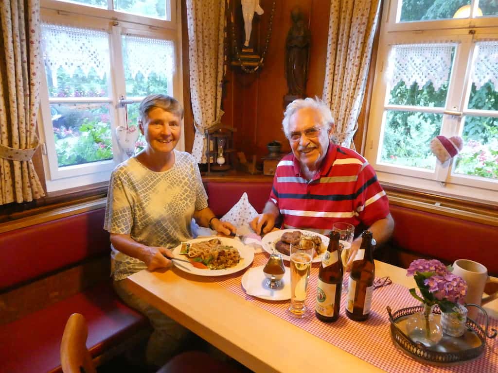 Es war steil und mühsam. Oben bei der Lindenbachhöhe auf 760 müM. angekommen, gab es weder Aussicht noch Einkehr. Einfach nur hohe Bäume. Einfach nur Natur, gute Luft und Tannenduft. Herrlich! – Der Rückweg bergab war nicht minder mühsam für unsere alten Knochen. Danach sind wir uns einig: im nächsten Gasthof gibt es etwas zu Essen und zu Trinken.