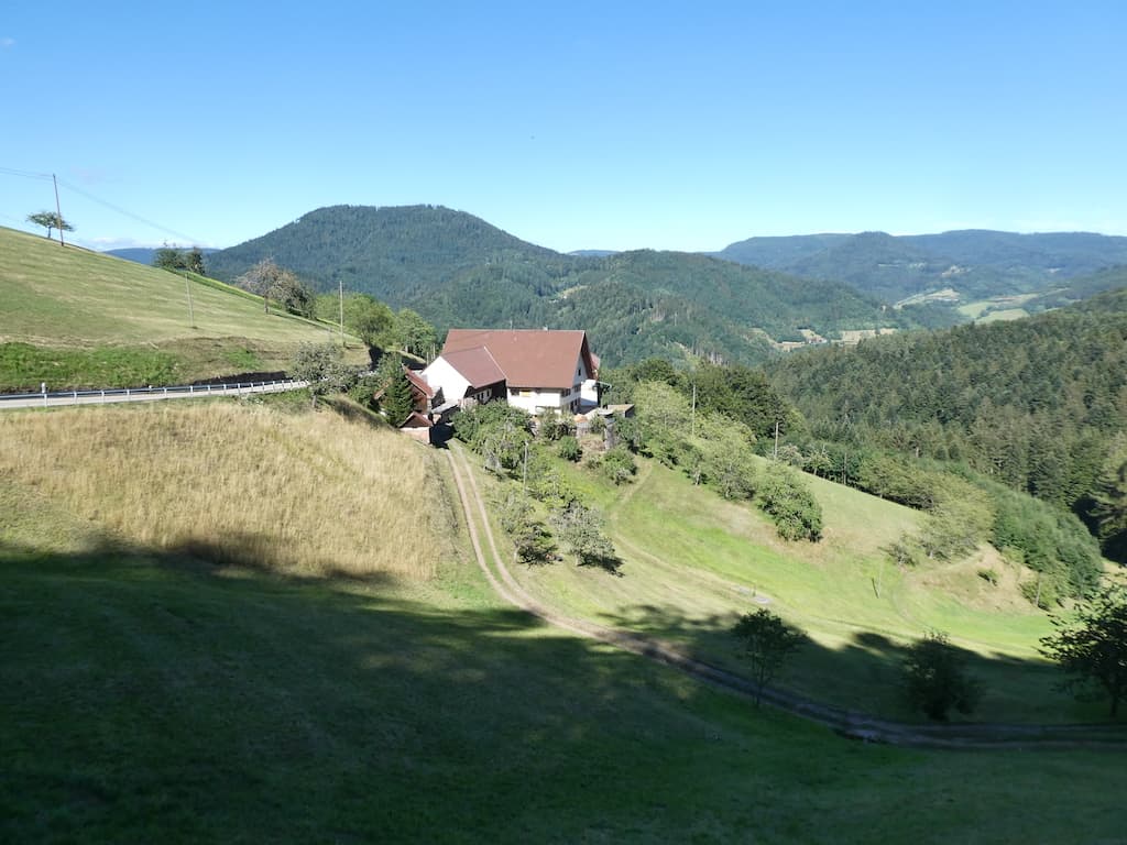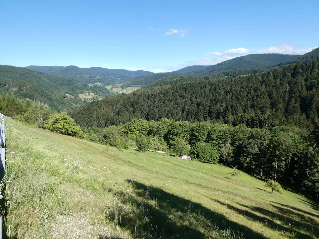 Nun geht es wieder auf einem kleinen Strässchen steil bergauf. Immer wieder mit toller Sicht in den Schwarzwald und auf Bauernhöfe im steilen Gelände.