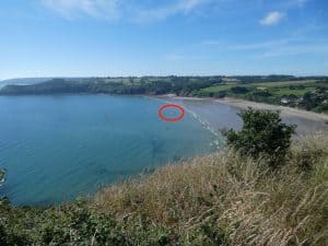 Unter uns die Bucht und der grosse Strand (bei Ebbe)