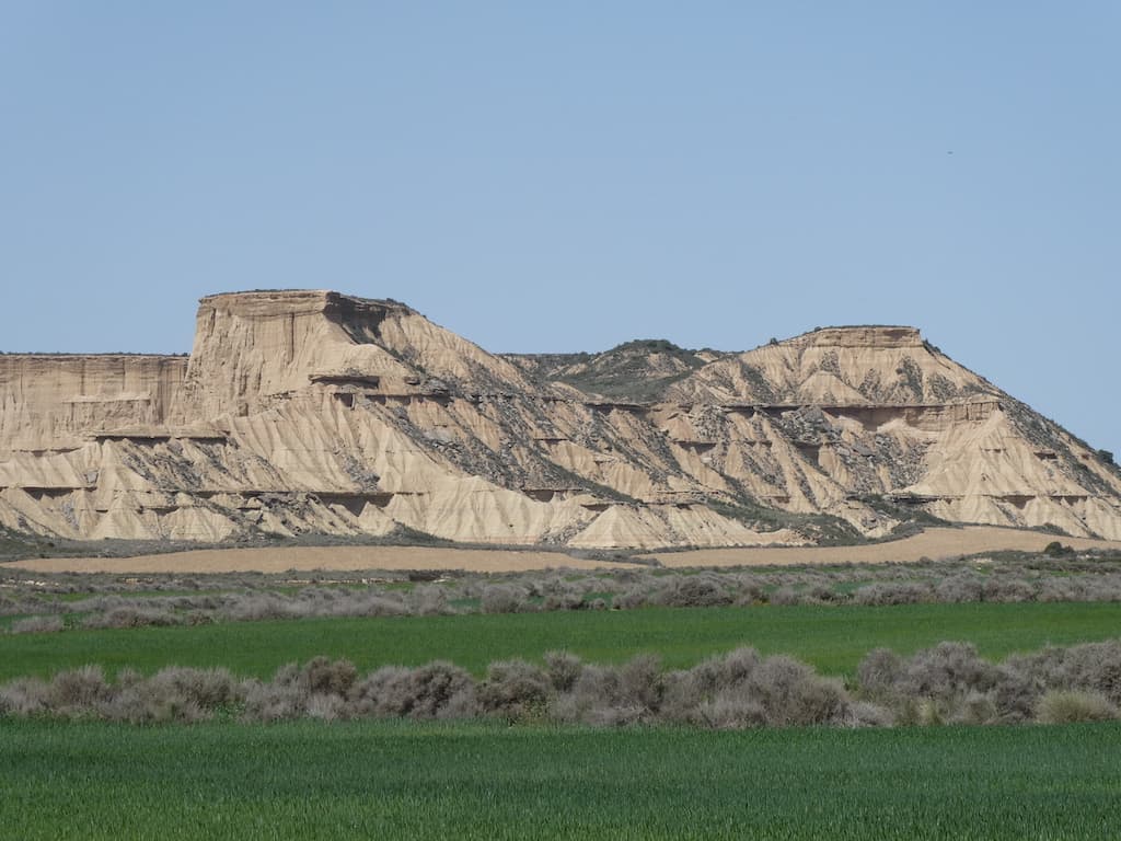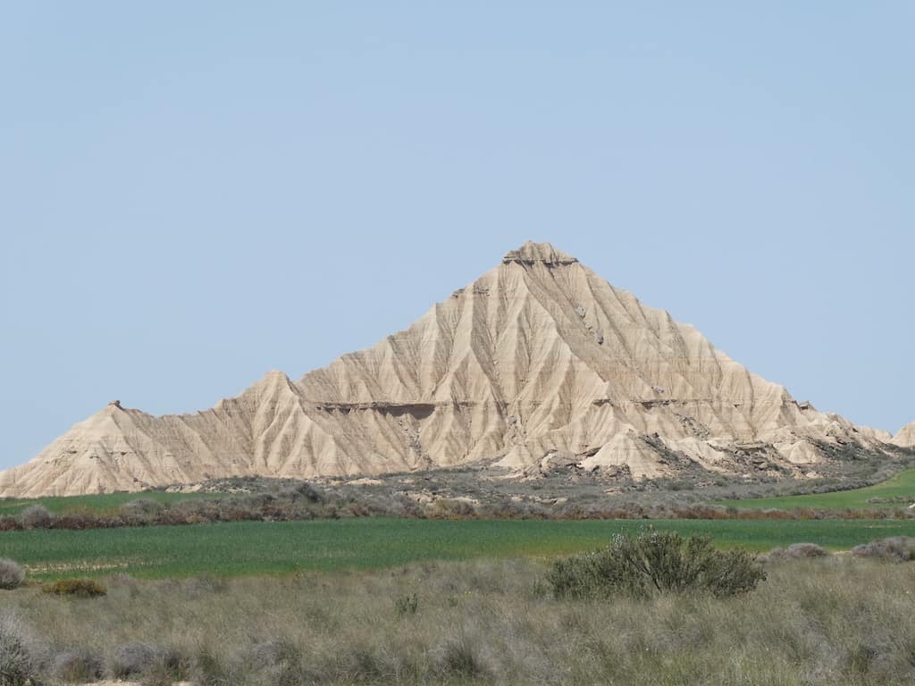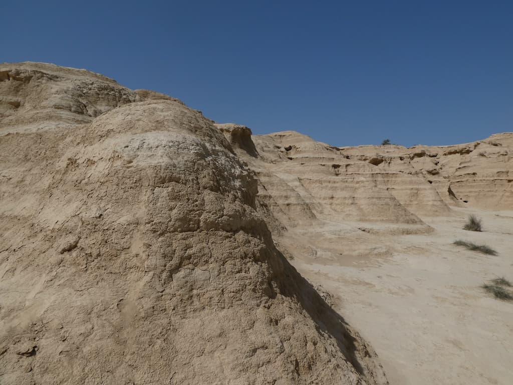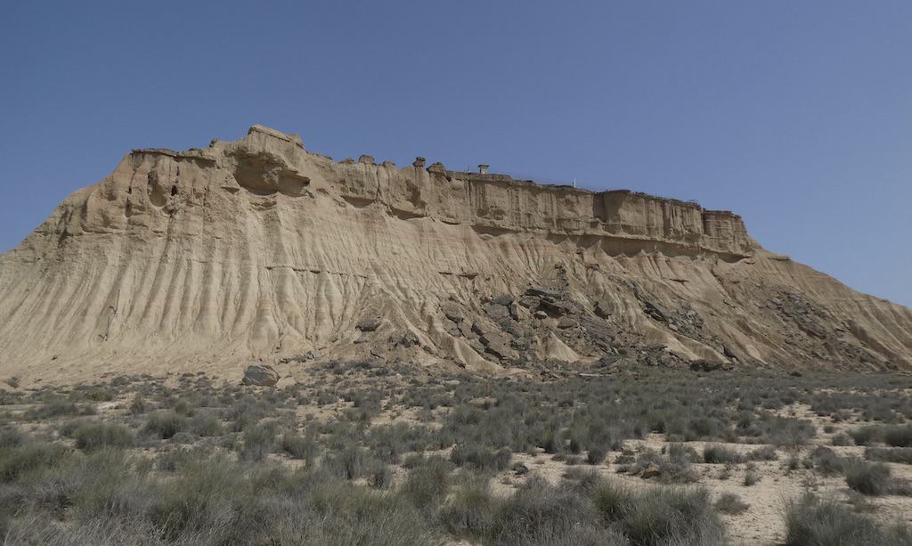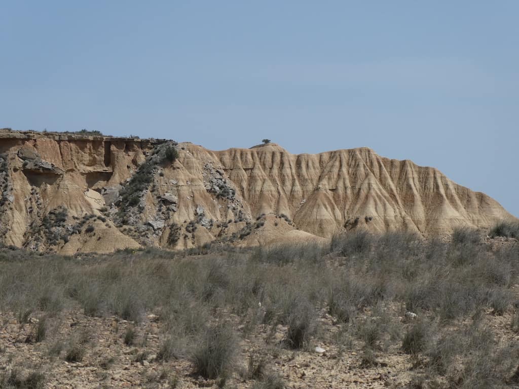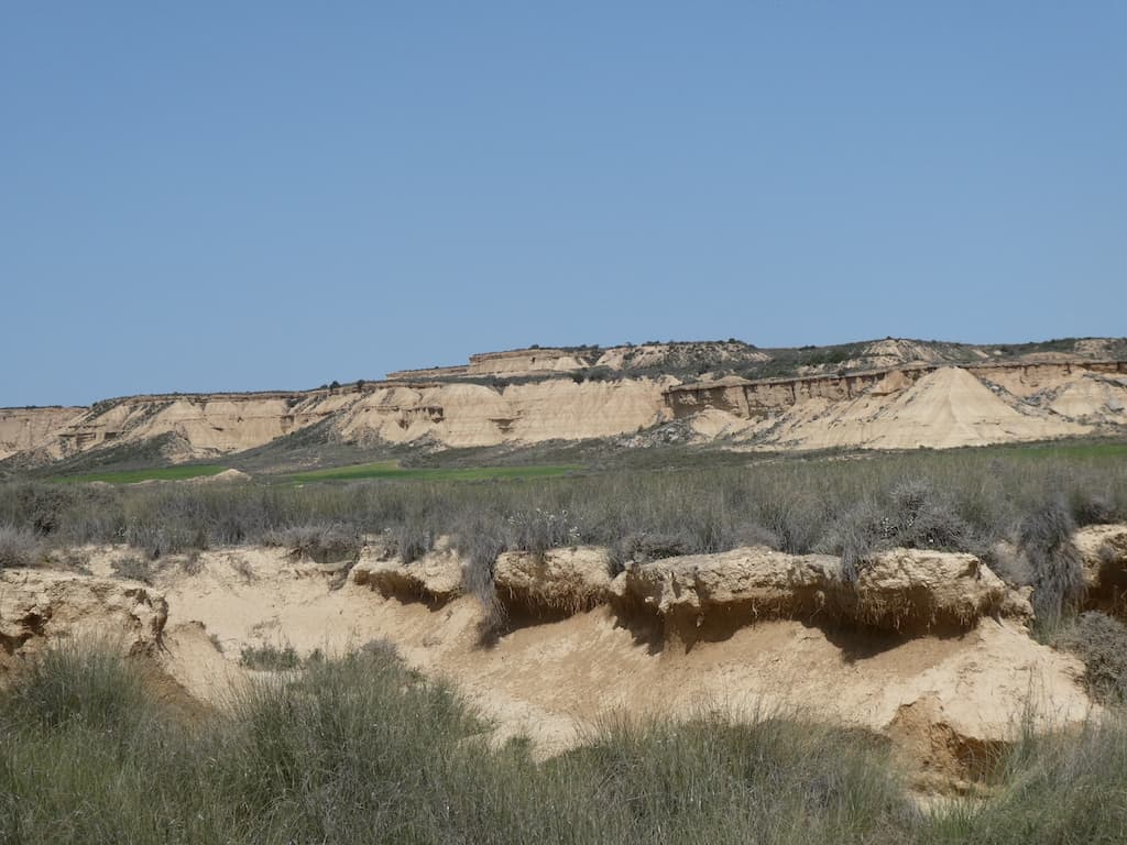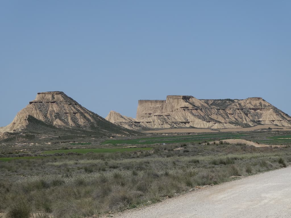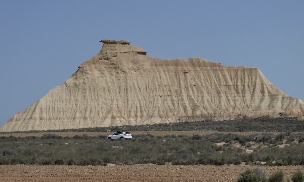 Nach wenigen Kilometern bekommen wir schon einen ersten Eindruck von der einzigartigen Landschaft. Bardenas Reales besteht zu einem großen Teil aus ockerfarbenem Lehm. Dieser Lehm ist das Sediment eines urzeitlichen Meeres, welches durch die tektonische Hebung der Iberischen Platte nach und nach verlandete.