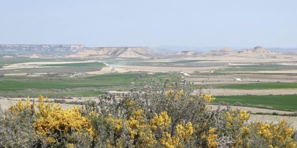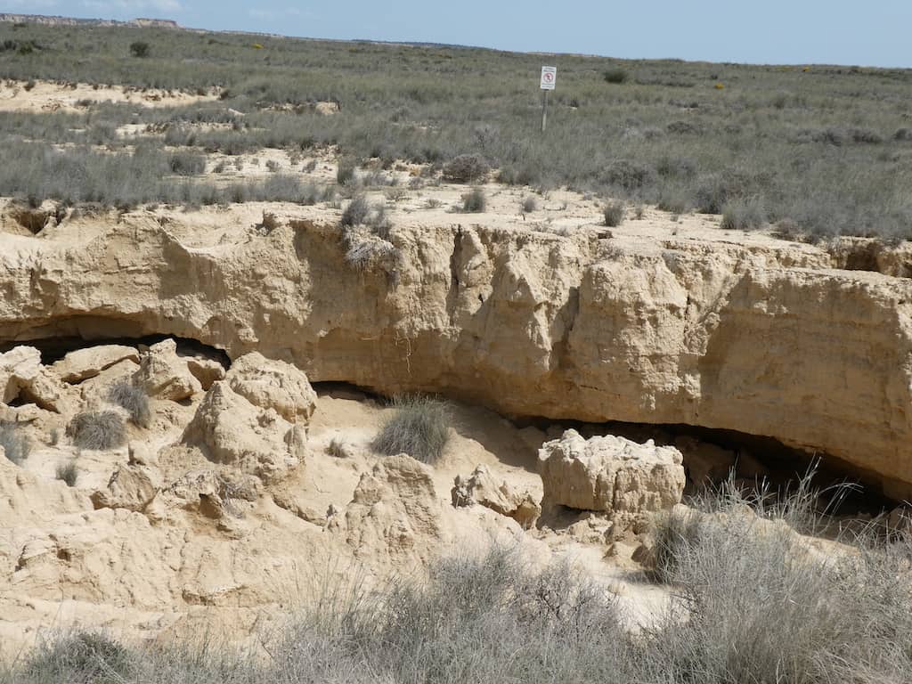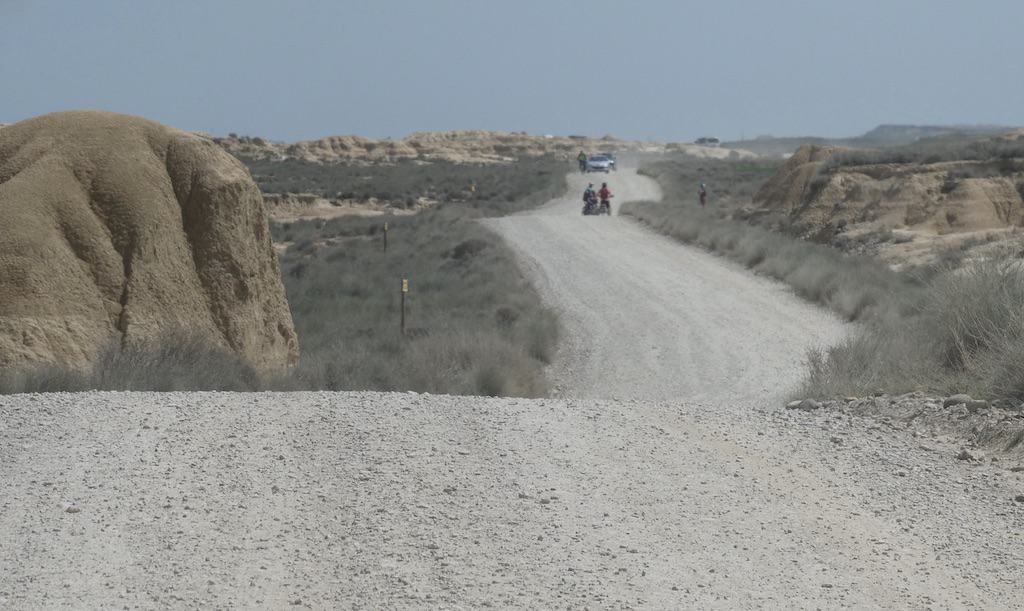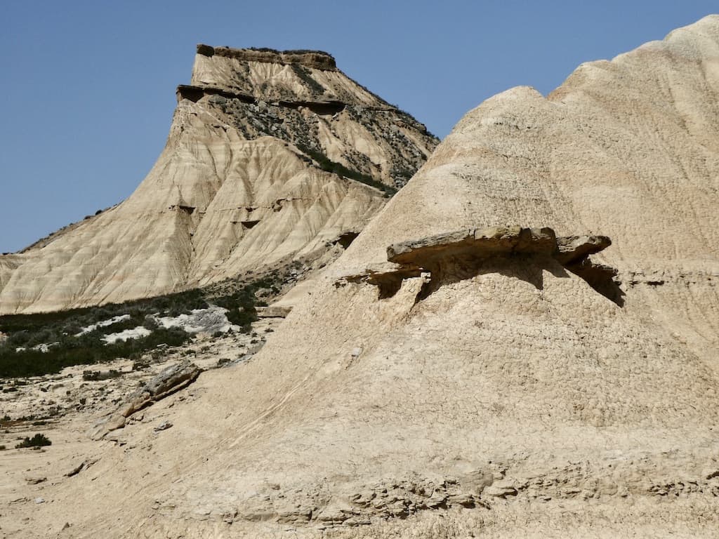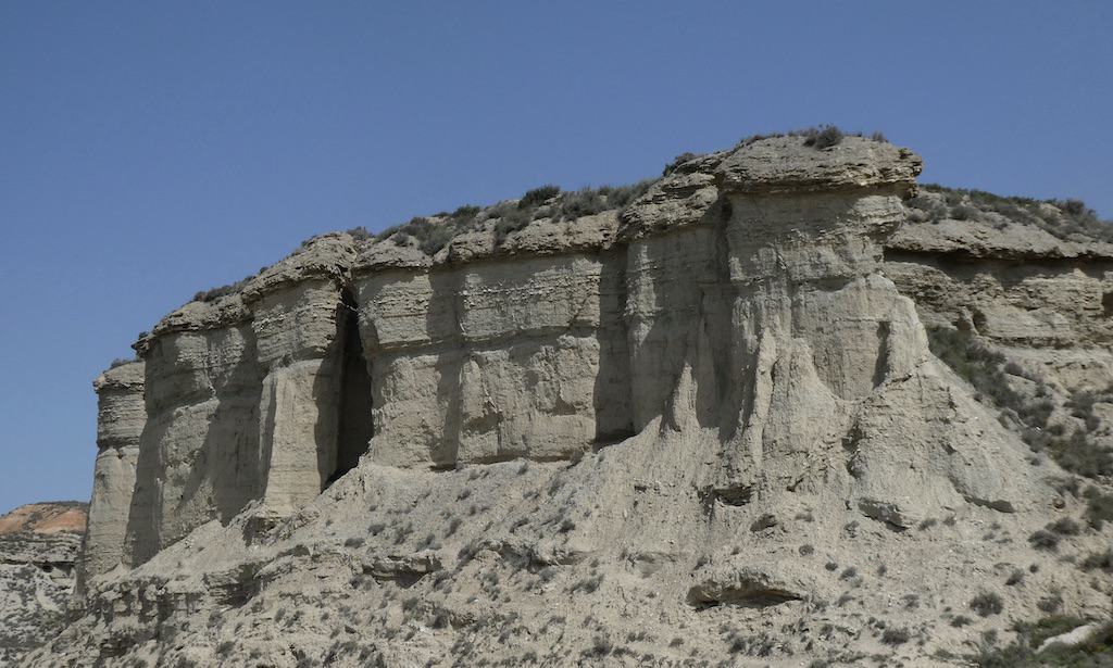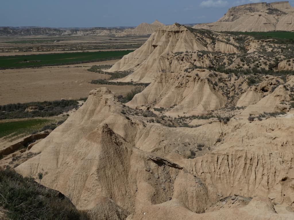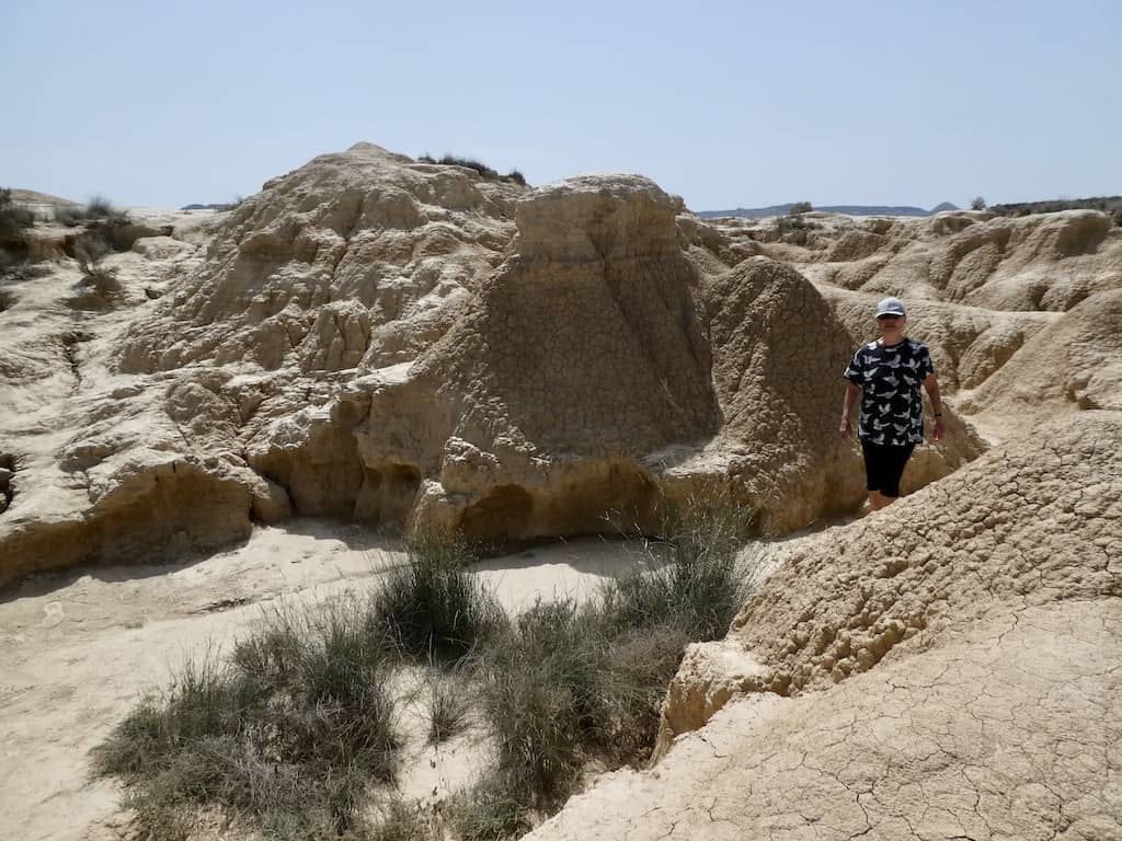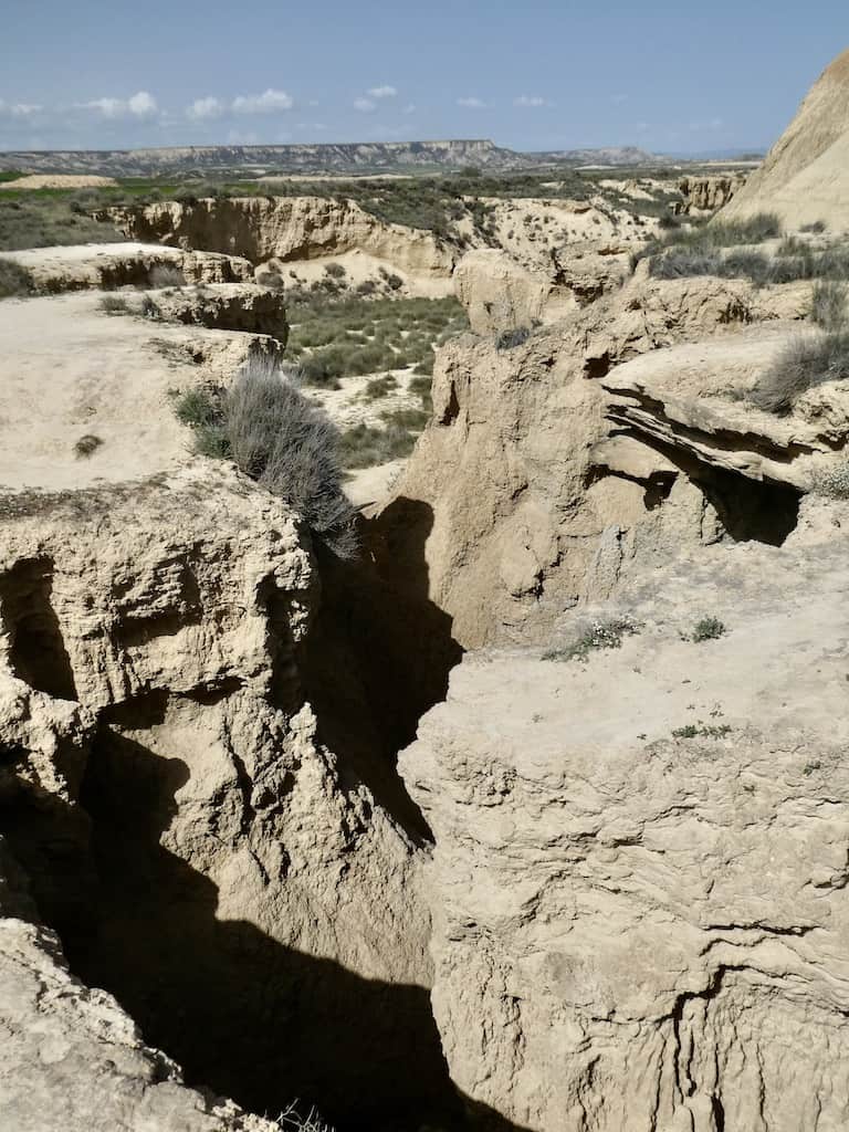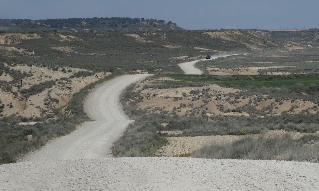 Nach wenigen Kilometern bekommen wir schon einen ersten Eindruck von der einzigartigen Landschaft. Bardenas Reales besteht zu einem großen Teil aus ockerfarbenem Lehm. Dieser Lehm ist das Sediment eines urzeitlichen Meeres, welches durch die tektonische Hebung der Iberischen Platte nach und nach verlandete.