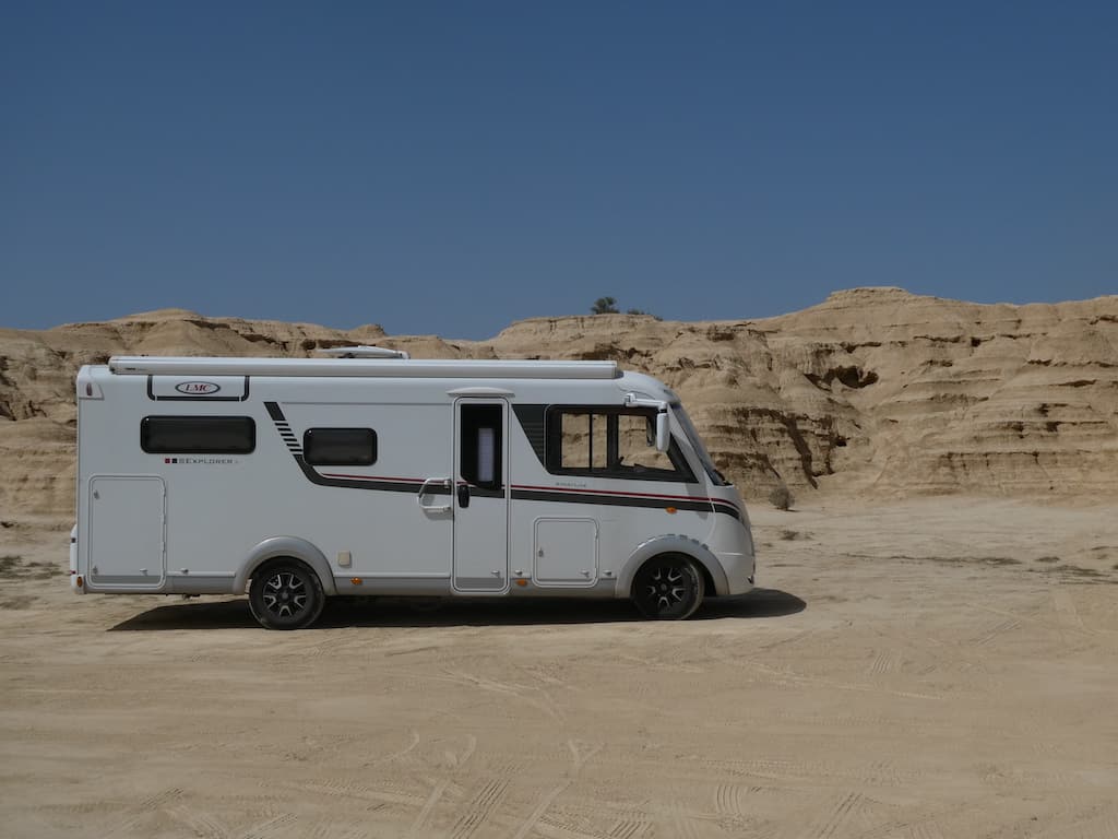Schon nach 5 Kilometern sind wir bei der Einfahrt zum Gelände der Bardenas Reales. Wir sind nicht die einzigen. Im Informationszentrum bekommen wir eine Landkarte sowie die Empfehlung, die Tour gegen den Uhrzeiger-Sinn zu fahren. Wir werden auch darauf hingewiesen, dass die Tour 34 Kilometer lang ist, wovon 30 Kilometer auf Naturpiste. Das wussten wir aber schon von anderen Campern und es sei machbar. Eine Eintrittsgebühr wird nicht erhoben.