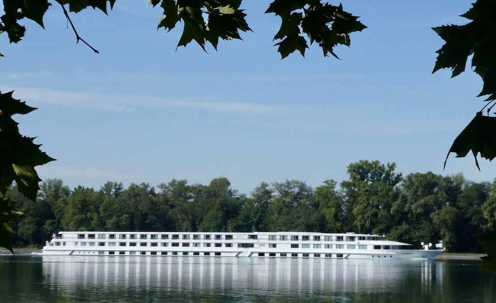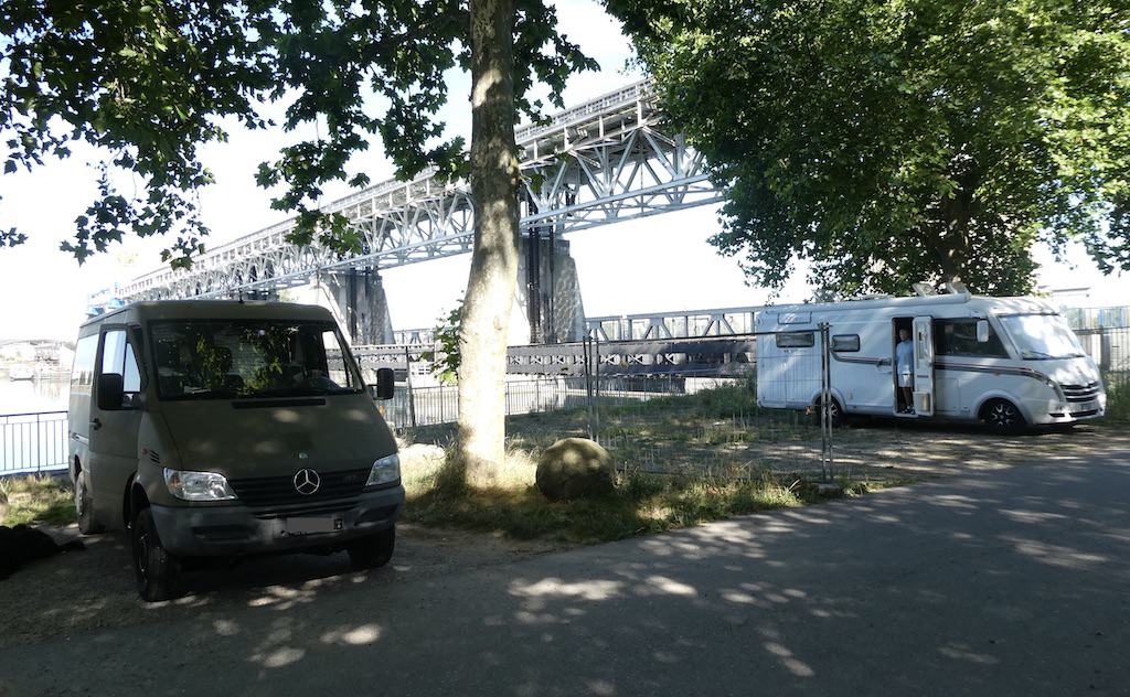 Wir haben hier am Rhein wieder wunderbar ruhig geschlafen. Morgens läuft ein elegantes Hotelschiff in den Schleusenkanal.