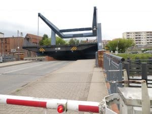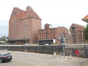 Durch die Brückenöffnung wurden wir aufgehalten, konnten dafür aber die grossen Backstein-Speicher am Peenehafen und kuriose Wasserfahrzeuge im Bild festhalten.