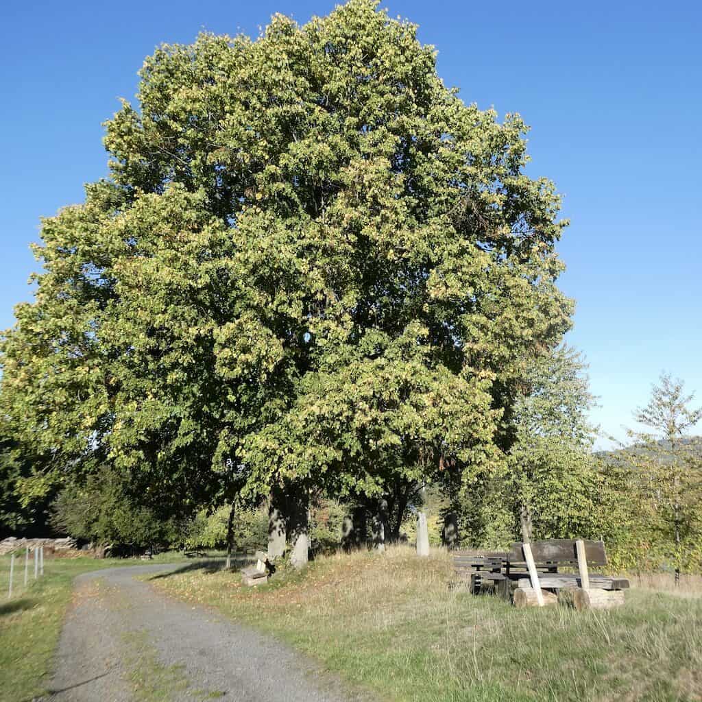 Unter einer riesigen Linde steht das Kulturdenkmal Kreuzsteingruppe.