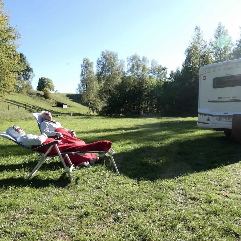 Wir haben uns einen Stellplatz in Bühren ausgesucht. Der liegt sehr einsam und idyllisch auf dem Land. Gleich daneben weiden die Schafe. Wir können heute tatsächlich einmal in der Sonne liegen. Eine Première auf dieser Tour. Wir brauchen zwar Decken gegen den kühlen Wind, aber wir geniessen das total.