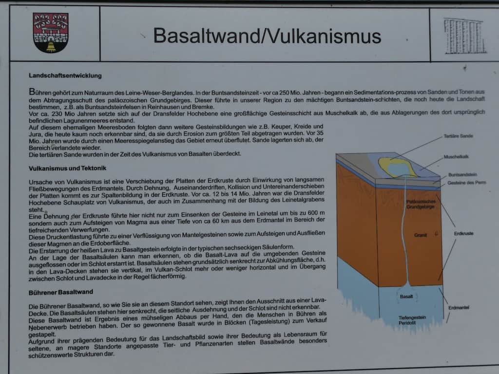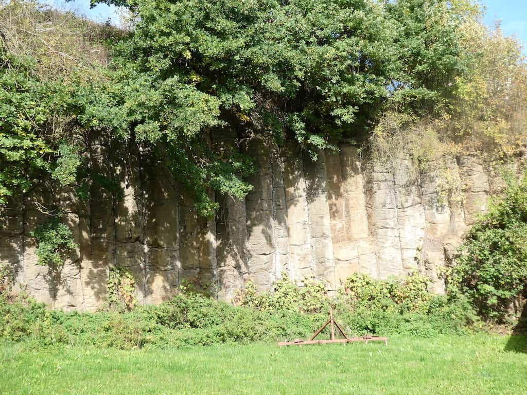 Gleich neben dem Stellplatz steht eine 10 Meter hohe Basaltwand. Die kantigen Säulen sind bei der Abkühlung des Magmas entstanden.