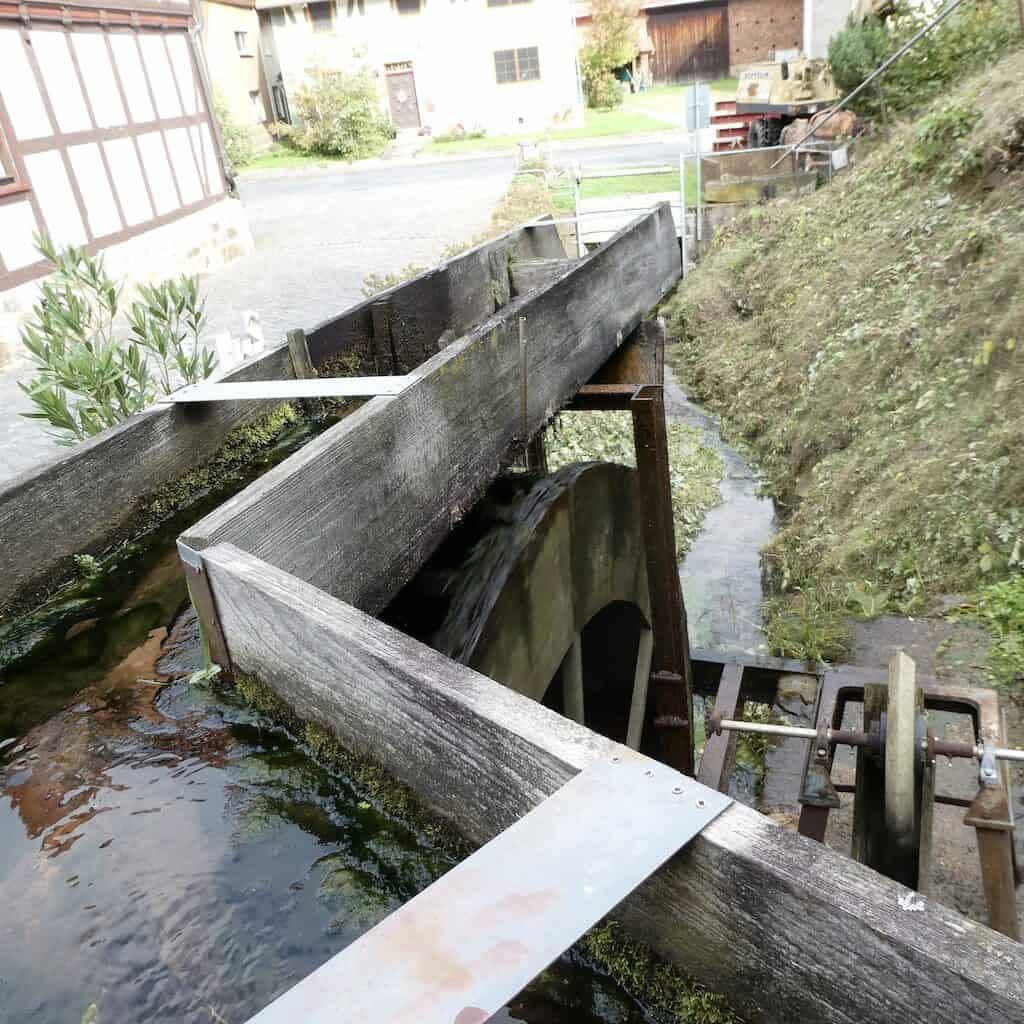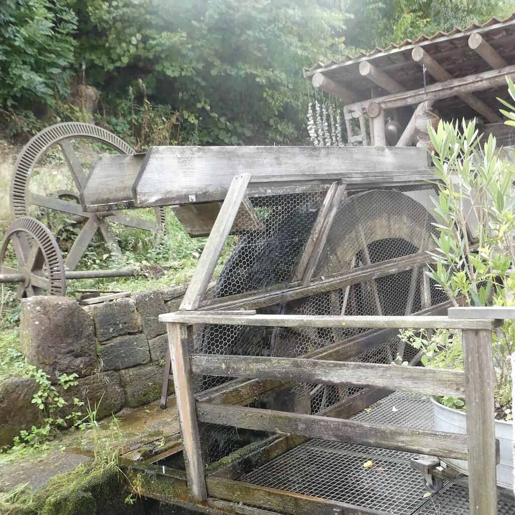 . . . dieses Wasserrad. Die Anlage wurde von Manfred Fischer 2007 erbaut. Der Maschinenbaumeister ist der Vater der Stellplatzbetreiberin und selbst auch ein alter Reisemobilist.