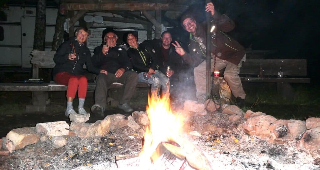 Nach 22 Uhr gesellen wir uns dann noch zu den anderen Campern, die an der Feuerstelle schon eine Weile in froher Runde feiern. Wir haben es noch sehr lustig, bei durchaus auch ernsthaften Themen. Auf dem Foto des harten Kerns sind neben uns Sandra und ihr Mann Dirk und der Feuerteufel Alex zu sehen. Alles sehr nette Leute, die vom Alter her unserer Kinder sein könnten.