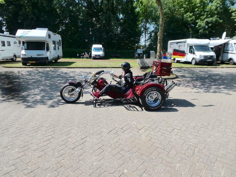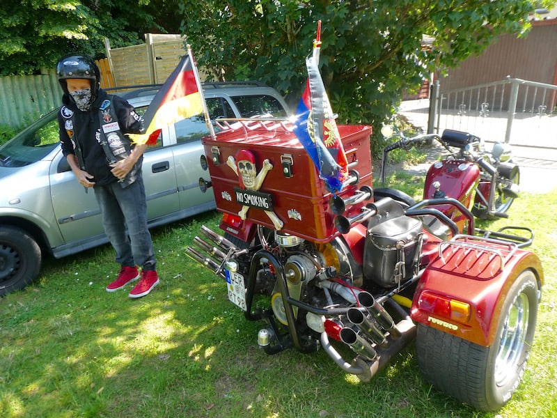Dieses Trike, eine Einzelanfertigung, startete vom Nachbarsgarten hier. Der stolze Besitzer, auch selbst ein Unikum, erklärte, dass es mehr Auto als Motorrad sei.