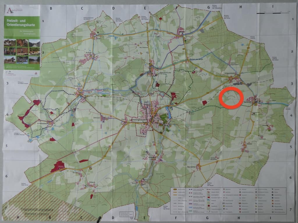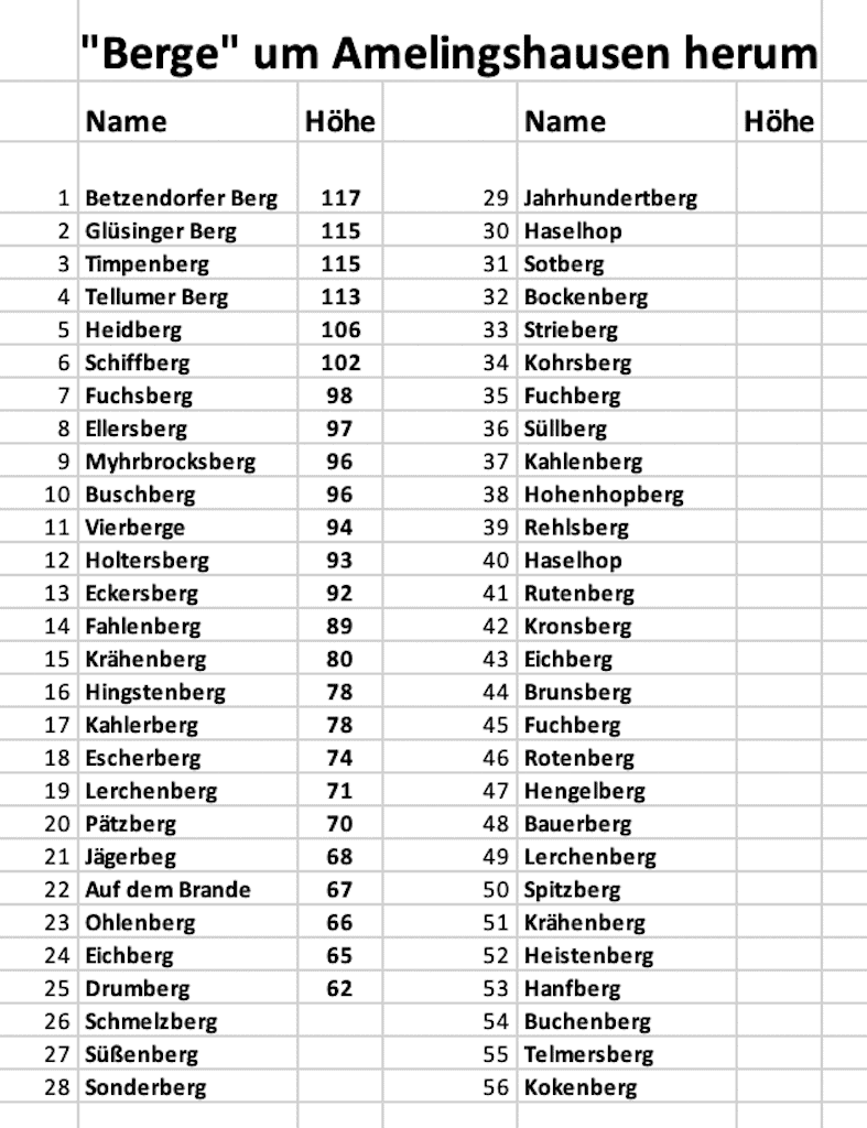 Das reizt Michael dazu, diese auf einer Excel-Tabelle zu erfassen. Nach dem Sortieren ist klar: der höchste „Berg“ von allen ist der «Betzendorfer Berg» (rot eingekreist) mit sage und schreibe 117 m.ü.M. Wir stehen auf 54 m.ü.M.