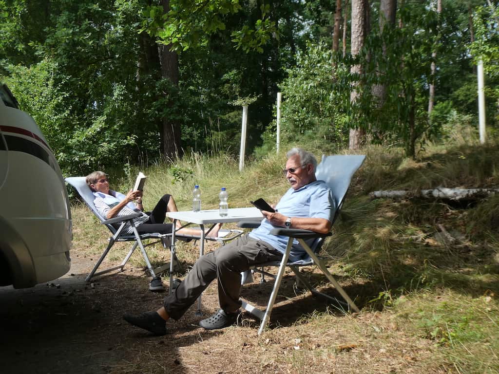 Gegen 17 Uhr kam urplötzlich ein starker Regenschauer. Es schüttete wie aus Kübeln. Da kam bei den meisten unserer Nachbarn plötzlich Hektik auf. Wir hatten zum Glück unsere Fahrräder schon lange vorher verräumt und die Markise eingerollt, da wir morgen weiter fahren wollen und ungern eine nasse Markise einrollen. Wir schafften gerade noch die Stühle in der Garage zu versorgen, aber für den Tisch reichte es nicht mehr. Der nimmt bei Regen aber keinen Schaden.