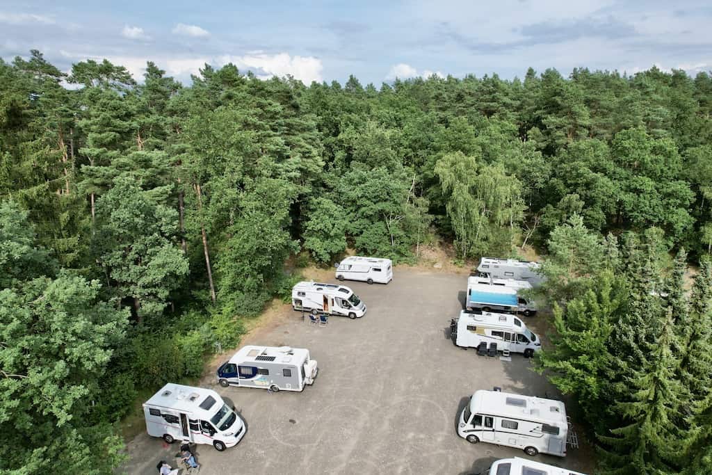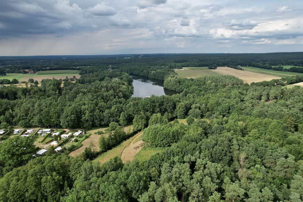 Die Luftaufnahmen zeigen den Stellplatz und in der Ferne den Lopausee, an dem wir gestern verbeifuhren als wir Heidschnucken suchten.
