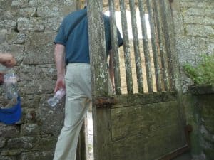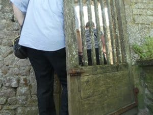 Am Ende unseres Rundgangs erholen wir uns etwas im Schatten bei dieser Ausgangstür. Wir machen uns einen Spass und schliessen diese Tür immer ein wenig mehr, bis sich die Leute hindurchzwängen müssen.