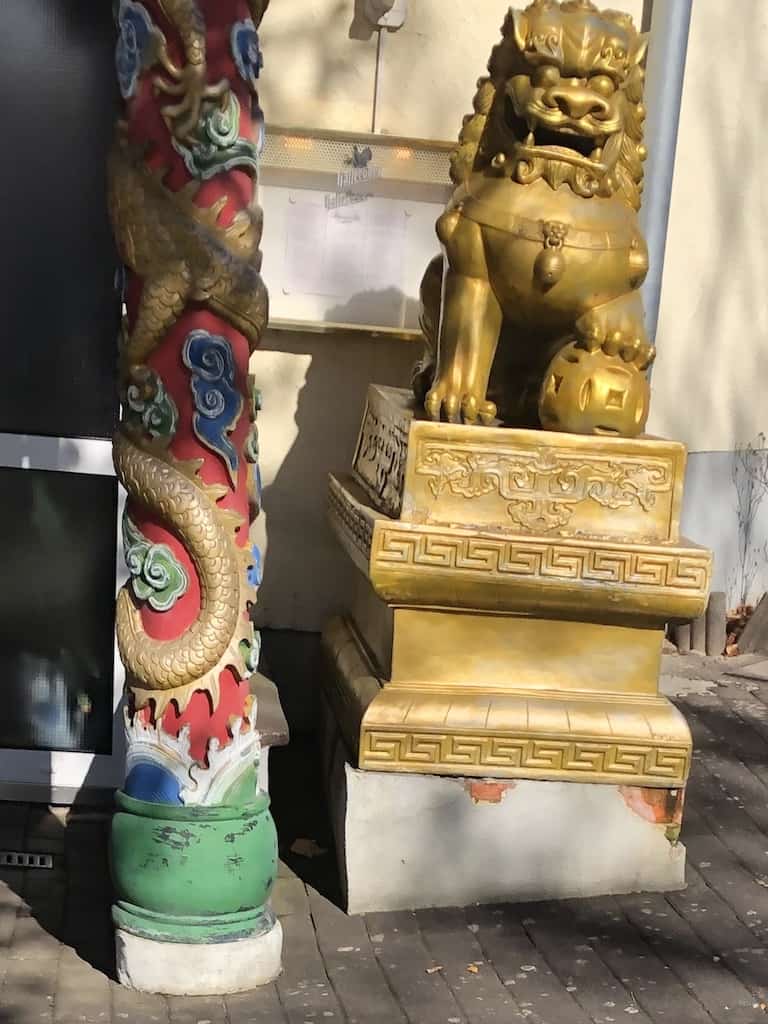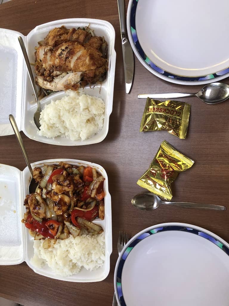 Auf dem Weg zum Stellplatz holen wir uns beim »Chinesen» (verspätetes) Mittagessen, was wir dann im Mobi verzehren. Obwohl es ganz ausgezeichnet schmeckt, schaffen wir nur die Hälfte, wie diese Portionen auf dem Foto erahnen lassen.