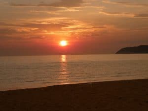 Ein schöner Sonnenuntergang, allerdings versinkt die Sonne nicht im Meer, sondern hinter Wolken.