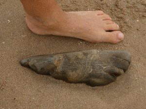 Renate stellt sich neben einen versteinerten Fuss. Ob er einst dem Ötzi von Mont-Saint-Michel gehörte?