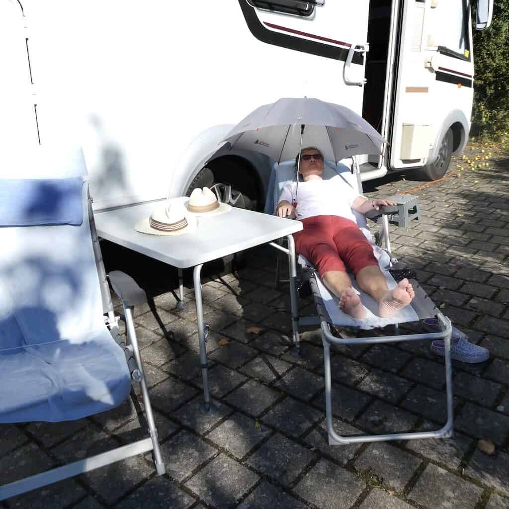 Nachmittags geniessen wir einfach die Sonne. Es ist erst das zweite Mal auf dieser Tour, dass die Temperatur dies zulässt. Später wird es Renate sogar am Kopf zu heiss. Von uns aus könnte dies noch einige Tage so weitergehen.