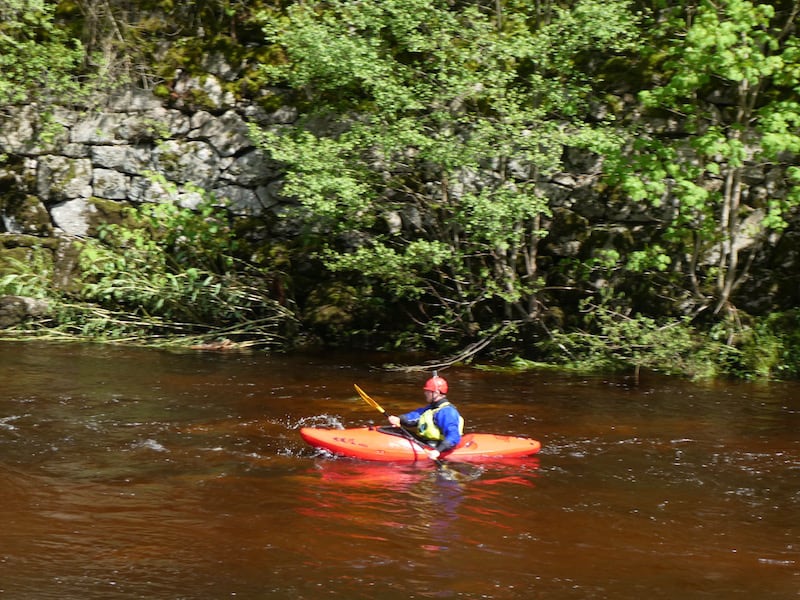 Auf dem braunen Wasser der Murg paddeln einige Kajakfahrer.