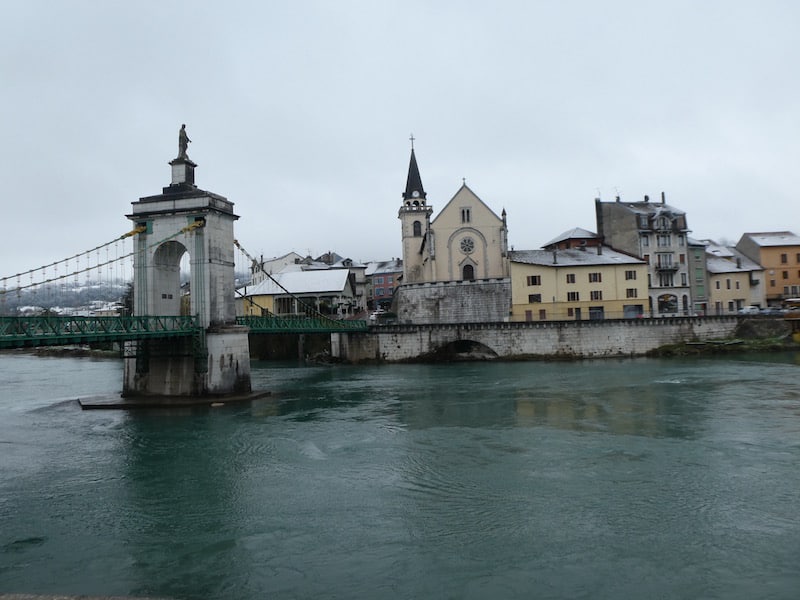 Der Blick auf den Ort und die Kirche „Saint Blaise“ und die Hängebrücke „Pont de la Vierge noire“ (Schwarze Jungfern-Brücke) aus dem Jahr 1838