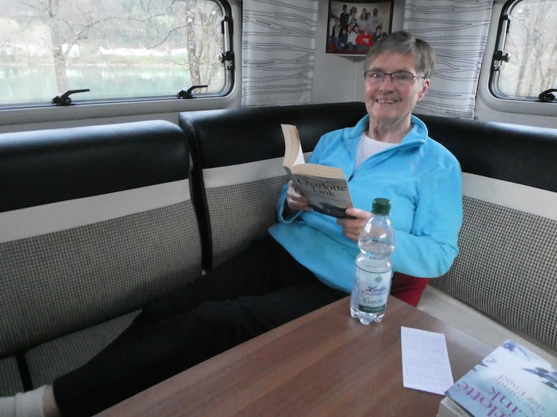 Renate ist schon sehr durch ein neues Buch „gefesselt“. Trotzdem bereitete sie uns ein feines Mittagessen zu: Salzkartoffeln, Wirsingkohl und Bouletten (Hackplätzli).