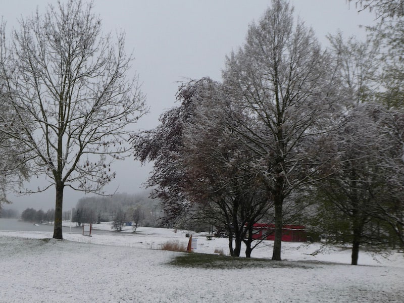 Heute Morgen waren wir überrascht, dass um uns herum alles weiss verschneit war. Wir stehen hier nur 250 m.ü.M.