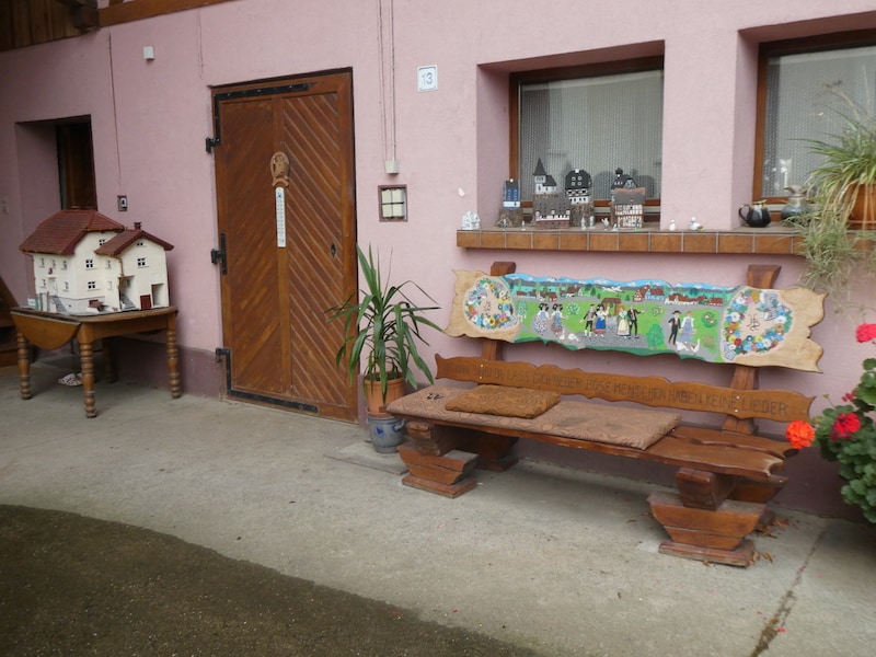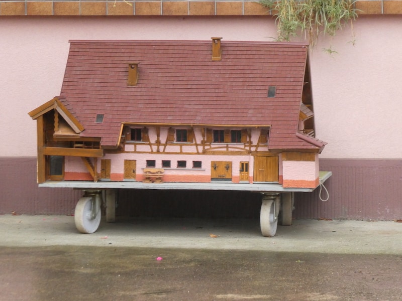 Bei einem Hof entdecken wir ein Modell des Gebäudes und daneben noch ein anderes aus dem Dorf.