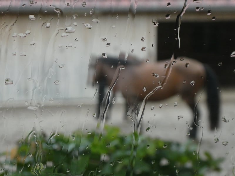 Der Stellplatz liegt mitten im Dorf, gleich hinter der Kirche. Knapp 700 Einwohner leben hier, davon auch viele Schweizer. Oft sind es Pferdeliebhaber, die hier ein altes Bauernhaus erwerben und wieder schön herrichten. Direkt vor uns liegt so ein Auslauf mit Pferden, im Regen vage zu erkennen.