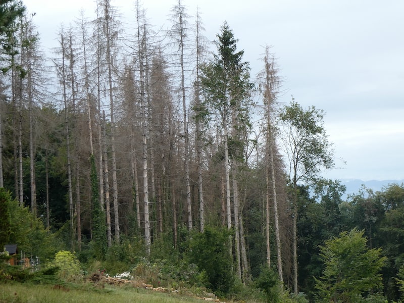 Gegen Abend hört der Regen auf. Wir können noch einen kleinen Spaziergang unternehmen. Dabei sehen wir hinüber zur Burgruine und auch auf mehrere abgestorbene Bäume.