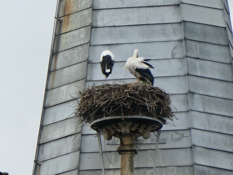 Renate entdeckt aus der Ferne, dass an diesem Kirchturm zwei Störche nisten.