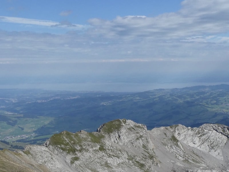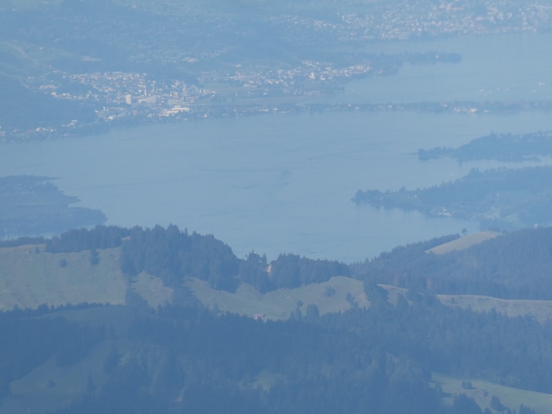Von verschiedenen Terrassen schauen wir in alle Richtungen. Die Fernsicht ist zwar nicht optimal, doch wir erkennen in der Ferne auf der einen Seite den Bodensee, auf der anderen Seite den Zürichsee mit dem Seedamm in Richtung Pfäffikon.