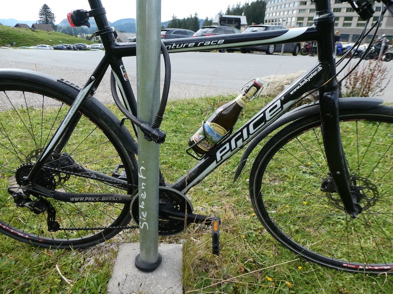 Viele kommen auch mit Motorrädern hier her, wahre Boliden. Aber viel besser gefällt uns dieses ganz normale Velo, besonders natürlich die Verproviantierung mit der Bierflasche Quöllfrisch.