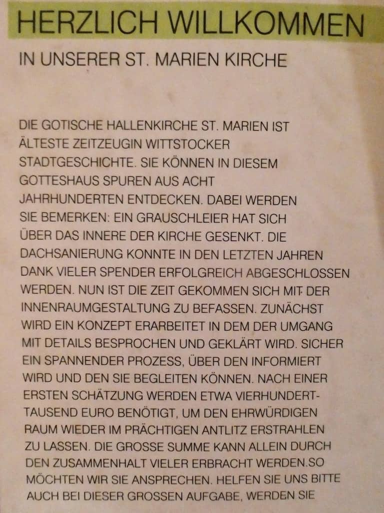 Die Kleinstadt Wittstock hat 16’000 Einwohner. Sie entstand aus einer slavischen Siedlung, wurde 946 in der Stiftungsurkunde für das Bistum Havelbergs erstmals erwähnt und ist damit eine der ältesten Städte Brandenburgs.