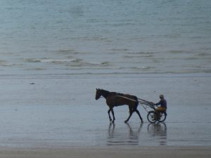 Ein Traber fährt auf seinem Sulky über den Strand.