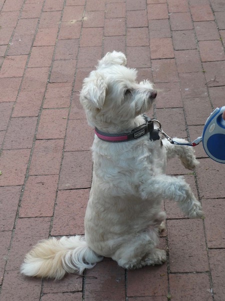 Auf dem Heimweg treffen wir auf einen drolligen kleinen Hund, der „Männchen“ vor seinem Frauchen macht.