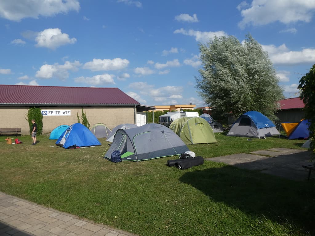 Auf dem Zeltplatz kommen heute junge Leute zum Kanu fahren.