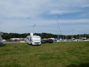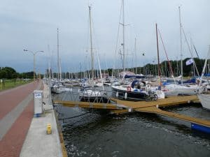 Nun stehen wir beim Yachthafen von Swinemünde auf einem Grünstreifen zwischen der Swine und dem Hafenbecken. Hier haben wir nach allen Seiten Hafenkino.