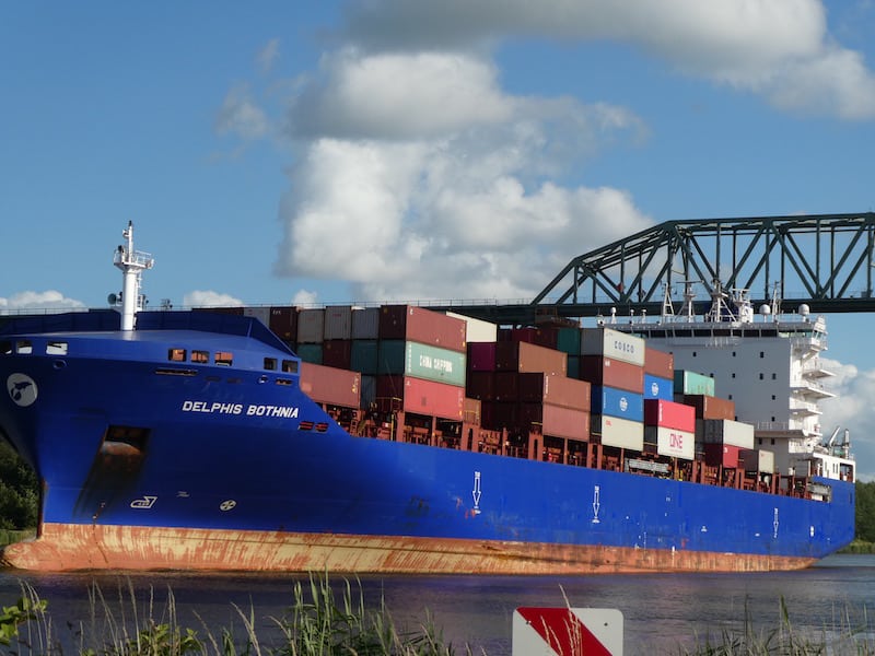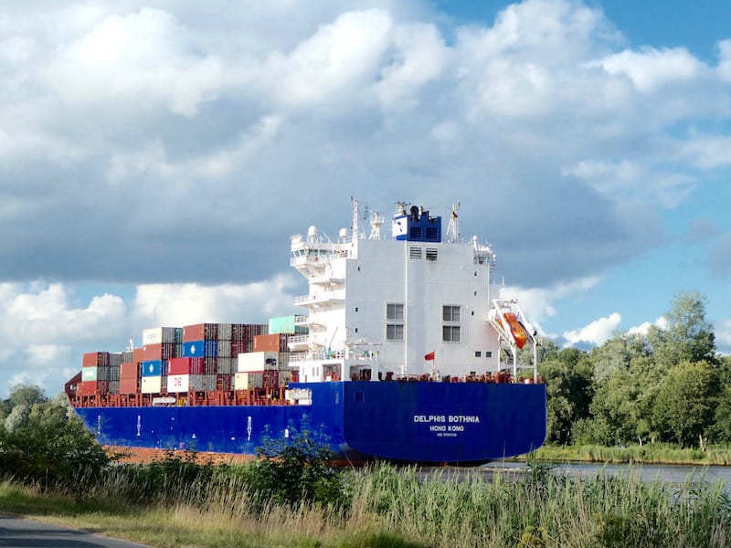 Ein riesiger Containerfrachter „Delphis Botnia“, Hongkong, 177 m lang und 30m breit.