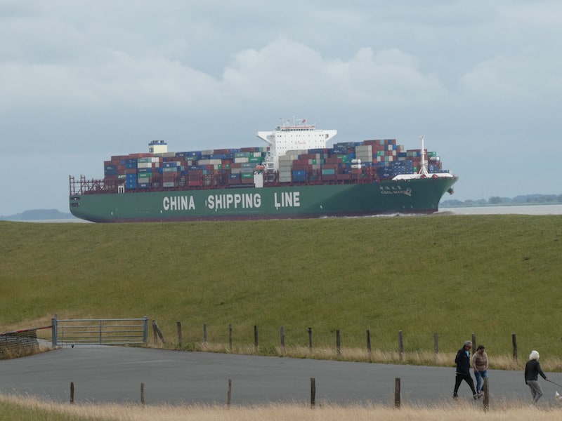 Am Deich zur Elbe sehen wir wieder grosse Schiffe (aber wir zeigen nur eines).