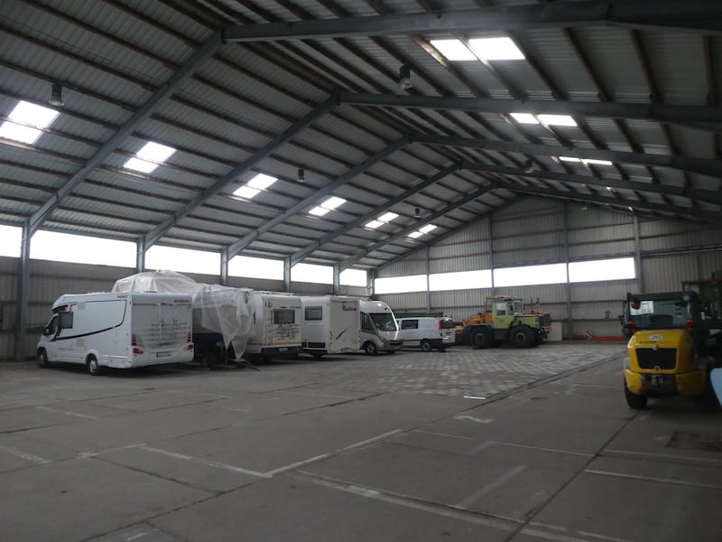 In der grossen Halle vermietet er Einstellplätze und auch sein eigener, schöner Camper steht hier.